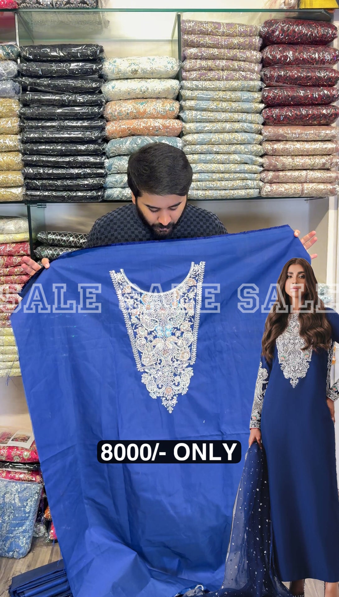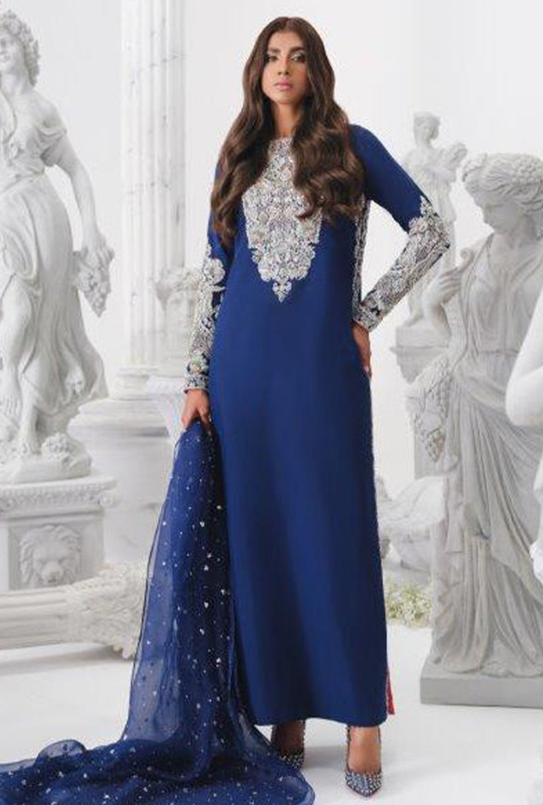 'Astral,' an obsidian, elaborately beaded pattern, includes subtle but elaborate embroidery in silver tones placed over a luscious midnight blue canvas. Fine workmanship on the slits complements the shirt, producing the ultimate exuberance of luxury. The shirt is additionally embellished with elaborate embroidery depicting nature's starry night on the sleeves & neckline. This mesmerizing pattern combines refinement & a timelessly fascinating design sensibility when paired with an organza sequin embroidered dupatta.