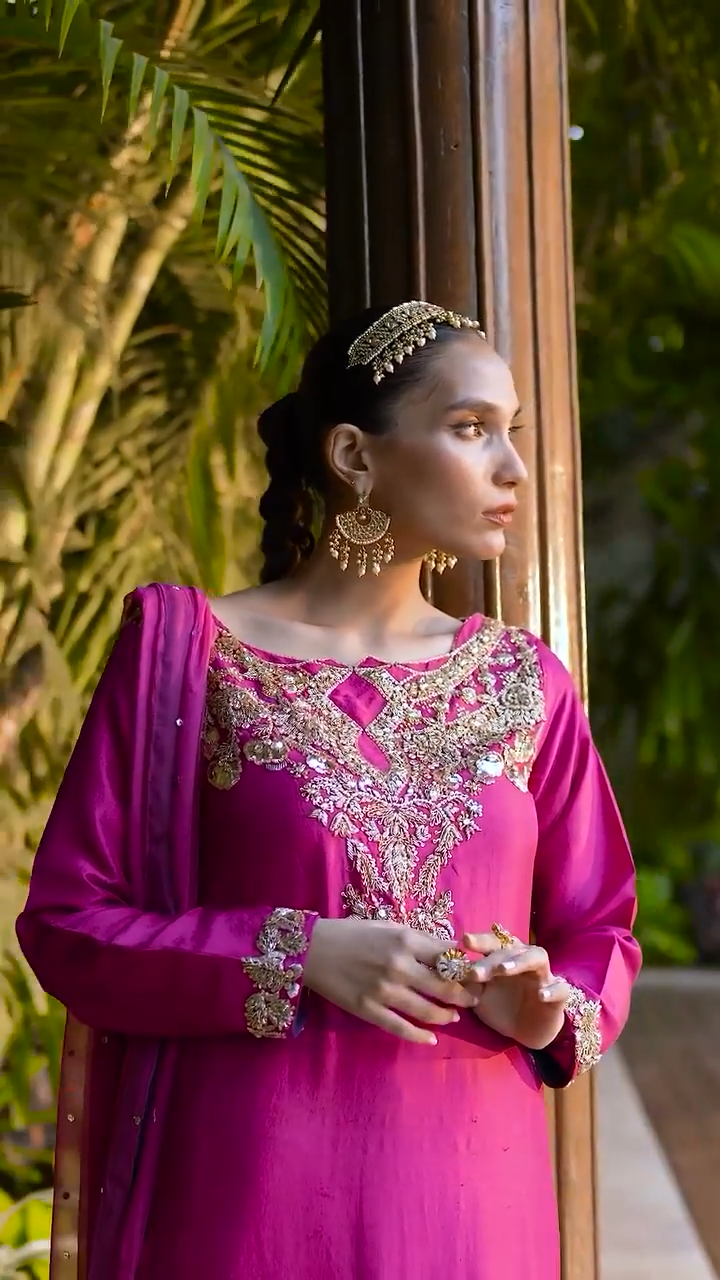 Introducing “Mayal”, an exquisite deep crimson ensemble that radiates timeless charm. This stunning outfit features a long kameez paired with sleek trousers. The kameez is made in rich and luxurious satin fabric in deep crimson. The front of the kameez is adorned with intricate embroidered artistry, blending traditional floral and paisley motifs with delicate geometric accents. Complementing the kameez are crimson trousers. To complete the look, a matching chiffon dupatta is delicately adorned with scattered sequins.