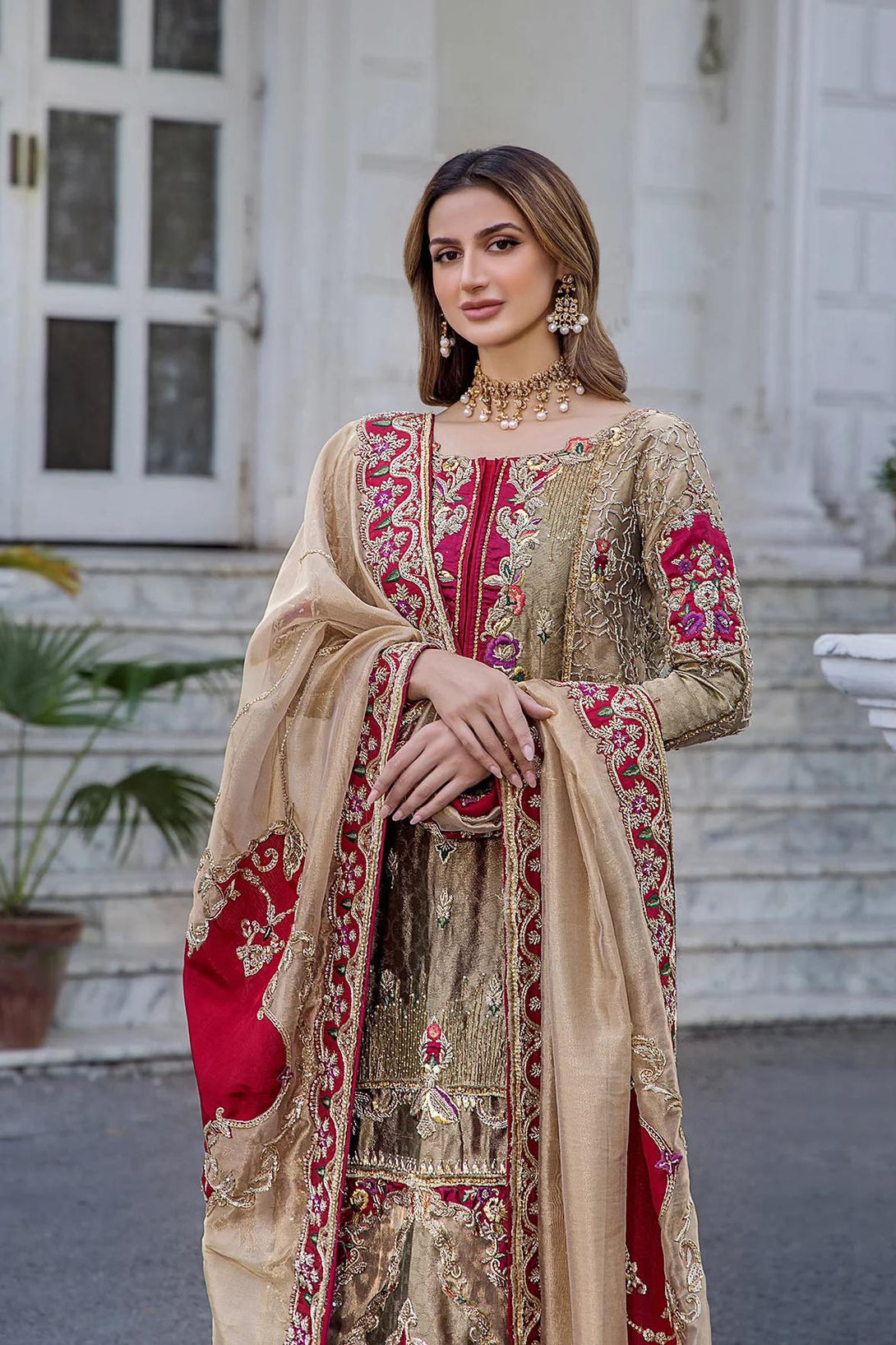 Indulge in a regal affair of hues with this champagne and crimson ensemble. The long straight shirt is a festoon of curated embroidery and embellishments, harmoniously paired with maroon embellished trousers and a festive dupatta, creating an opulentl look.