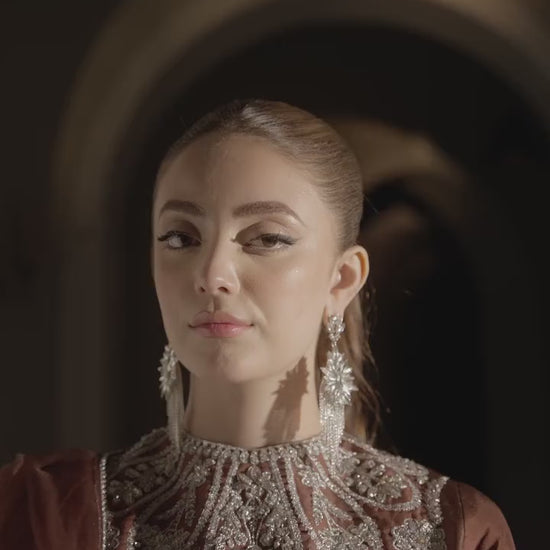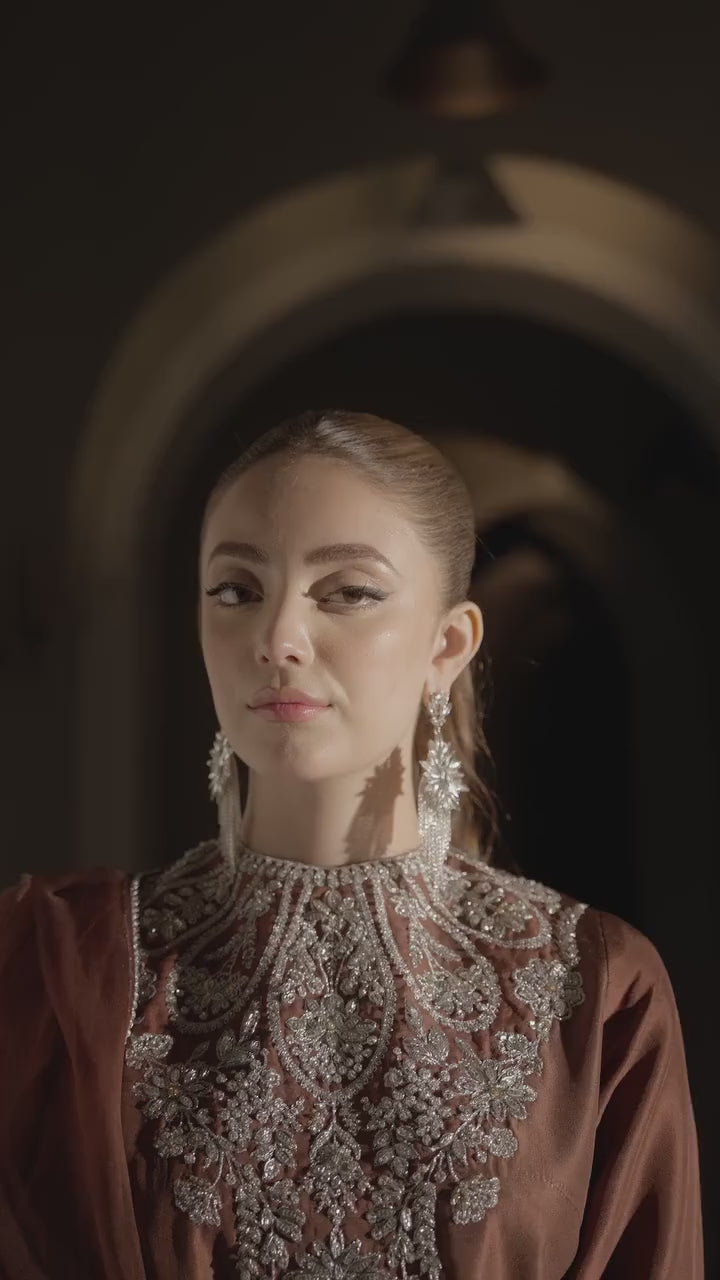 "Mocha" Designed for timeless sophistication. The long silk shirt, tailored with classic side slits, is adorned with intricate tilla embroidery and heavily embellished with kashti crystals, sequin baithki, and cut dana gracefully accenting the neckline and corners of the daman for a radiant, detailed finish.