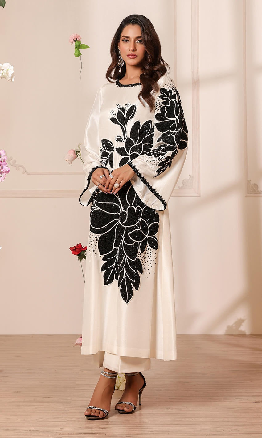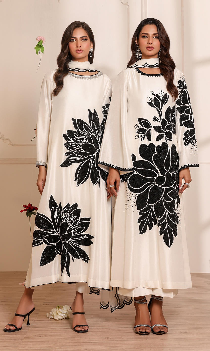 This elegant white outfit features an embellished neckline trailed by intricate floral handwork on a raw silk shirt. Paired with plain raw silk pants and a chiffon dupatta featuring a scalloped border.