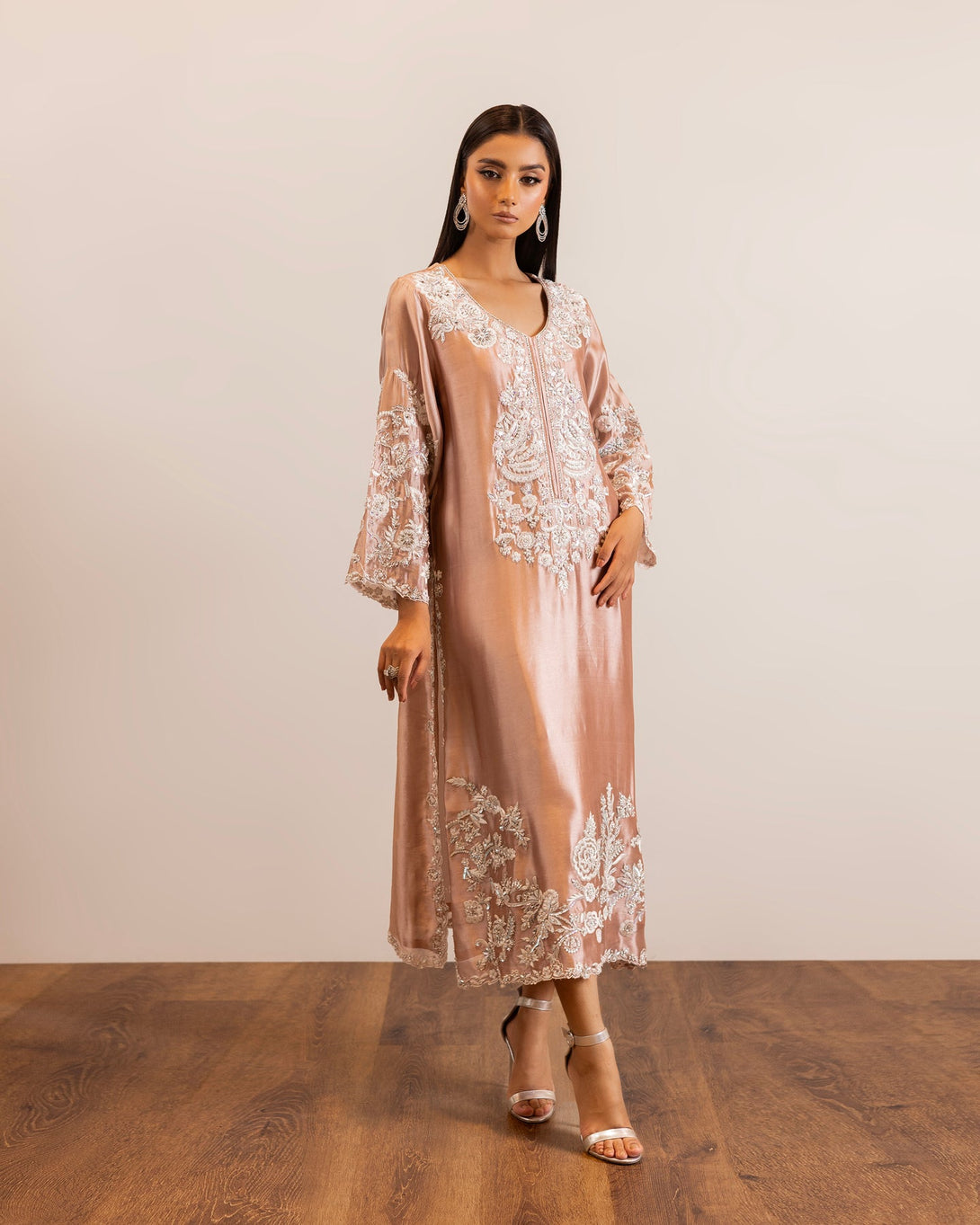 Presenting our beautiful pure Shisha Silk ensemble in a stunning Crepe Pink shade! This full set includes a long, loose-fit shirt adorned with intricate Resham embroidery on the neckline, sleeves, hem, and paired with elegant Azaar pants. Perfect for a graceful, timeless look.