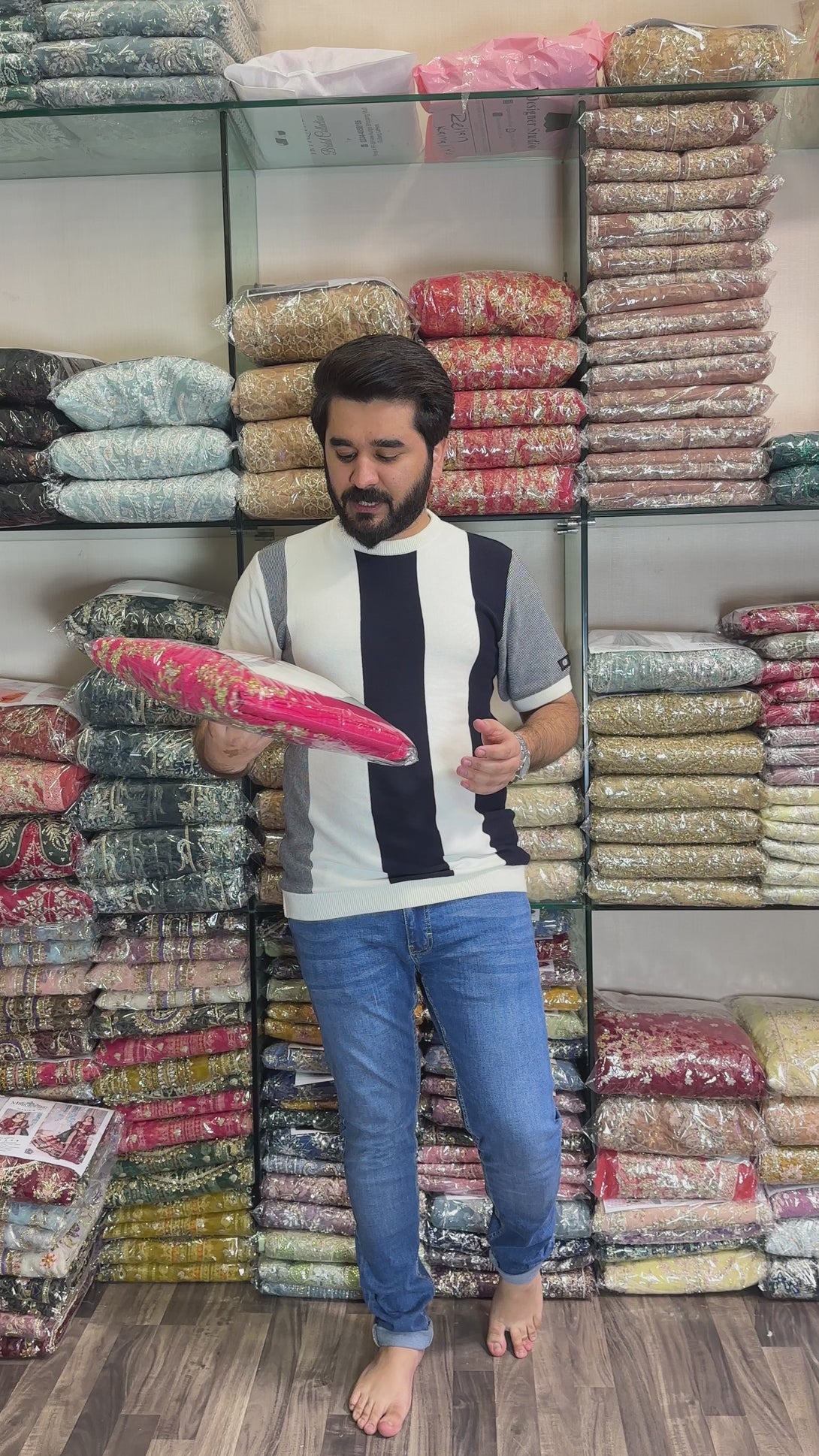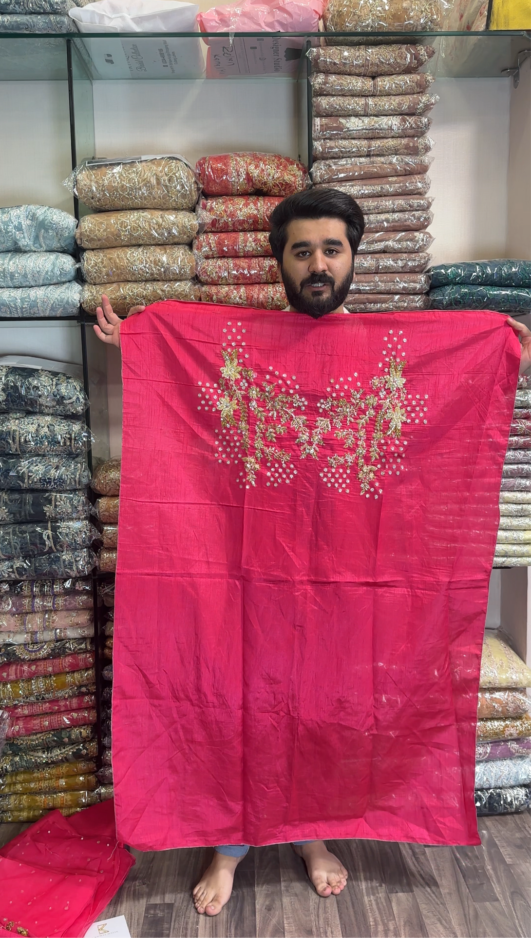 Prepare to captivate in our Shocking Pink Ensemble! A straight, long shirt crafted from luxurious pure raw silk boasts a modern allure with full hand embellishments, promising to dazzle with every step. Paired seamlessly with cigarette pants for a chic silhouette, and adorned with an embellished organza dupatta, this ensemble exudes sophistication and style. Immerse yourself in the bold elegance of our captivating creation, designed to command attention and leave a lasting impression.